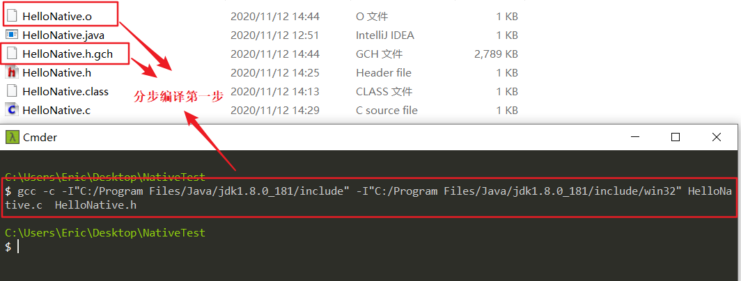 $ gcc -c -I"C:/Program Files/Java/jdk1.8.0_181/include" -I"C:/Program Files/Java/jdk1.8.0_181/include/win32" HelloNative.c HelloNative.h