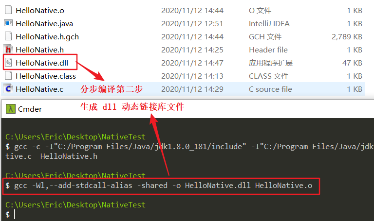 为了演示分步编译,我们先把上面一次性编译生成的动态链接库文件 HelloNative.dll