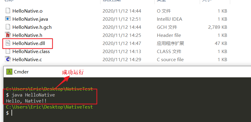 我们可以看到 Java 类已经可以成功运行了,并且我们也可以看出它运行的实际是我们使用 C 语言编写的实现方法,它作为本地方法 native 来被 Java 代码调用。
