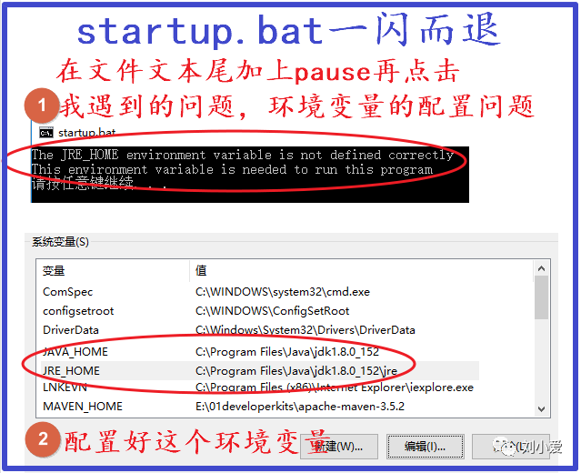 我这边运行后提示说我的JRE_HOME环境变量有问题,所以配置关于JRE_HOME的环境变量。