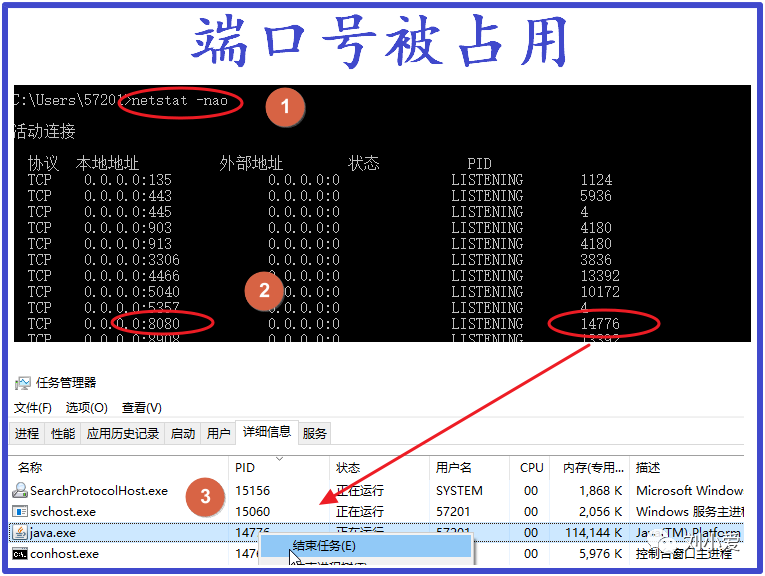 Windows+R,输入cmd,进入DOS,再输入命令:netstat –nao。