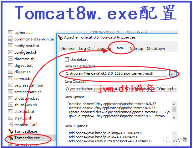 在Tomcat安装目录下有一个Tomcat8w.exe文件,将jvm.dll的文件路径配置进去即可。