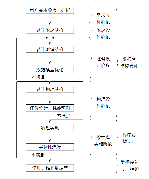 需求分析 → 概念设计 → 逻辑设计 → 物理设计 → 数据库实现 → 运行与维护阶段。