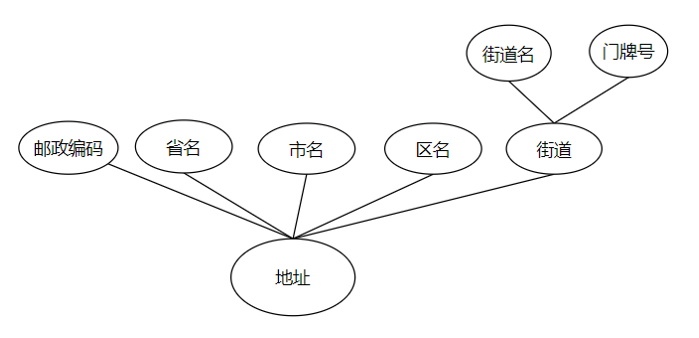 某些属性还可以划分具有独立意义的子属性,那这类属性就称为复合属性。例如人的姓名可划分为“姓”和“名”;地址属性可以划分为邮政编码、省名、市名、区名和街道这些子属性,而街道又可划分为街道名和门牌号,其层次结构如下: