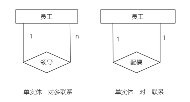 单实体联系也可分为一对一、一对多、多对多联系,如员工和员工之间的“领导”关系就是一对多联系,员工与员工之间的配偶关系是一种一对一联系。