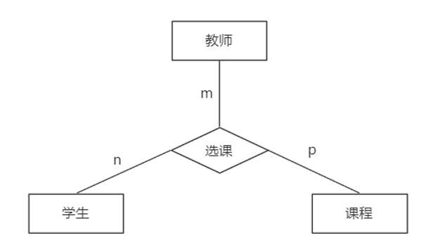 一般地,两个以上的实体之间也存在一对一、一对多和多对多的联系。例如学生选课系统中有三个实体:学生、教师、课程,此时它们之间的联系如下:
