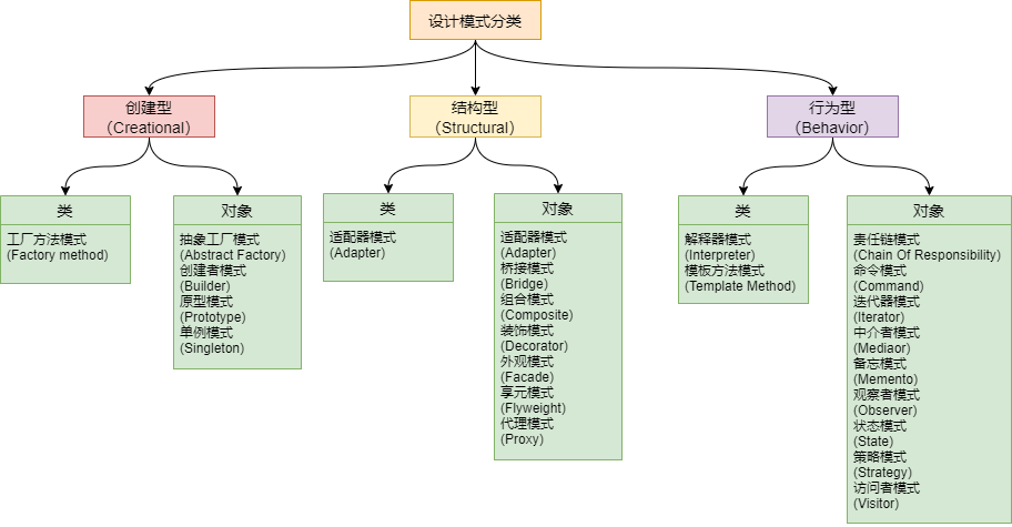 设计模式按其组织结构可以分为创建型、结构型和行为型,其详细分类如下图所示: