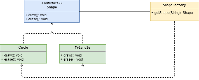 我们通过一个实例来描述一下简单工厂模式的使用:假如我们现在需要开发一个图形界面工具,然后将这个工具提供给一个客户去使用,系统初期我们只需要画一个圆(Circle)和一个三角形(Triangle)即可。那么我们的工具就按照如下的方式设计。