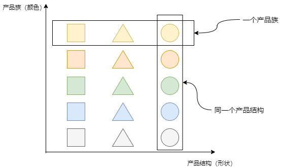 那么我们有没有办法对当前的设计方案进行优化,减少一些工厂类的产生呢?我们下面对当前的系统做进一步抽象。以形状为类的级别、颜色为族来对当前系统作进一步改善: