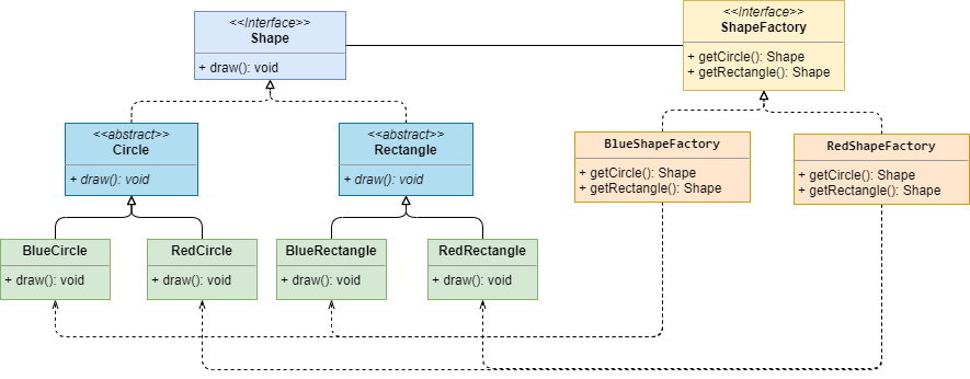 具体类族的划分我们以颜色为基础,不同类族的对象我们通过对应的具体工厂来创建。所以首先我们需要定义一个抽象工厂,具体工厂(族)实现抽象工厂的方法来生成一组具体对象。