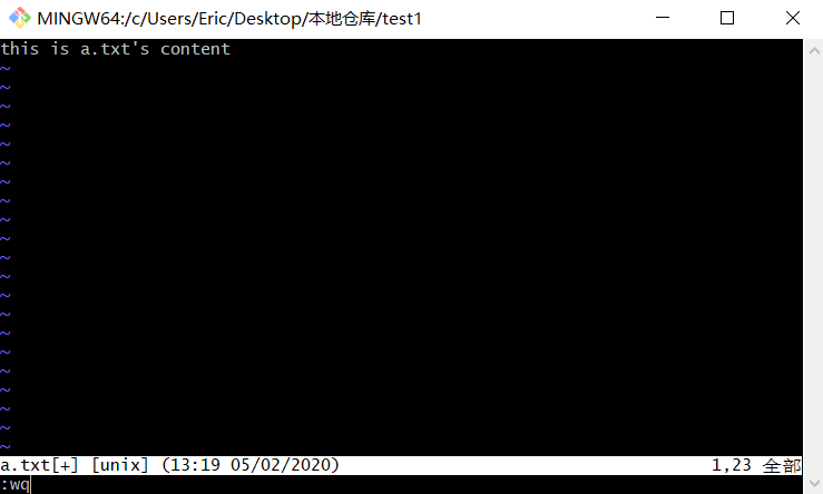 vi a.txt打开a.txt后,如下图,按“i”进入插入模式,修改文本内容为“this is a.txt's conten”,再按ESC键退出插入模式,再输入“:wq”内容并回车保存退出此编辑窗口。