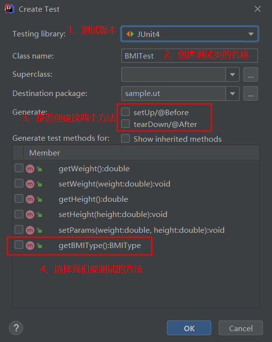 指定参数化运行器Parameterized.class,在类上使用注解@RunWith(Parameterized.class); 定义私有属性参数,以便于初始化将要测试的类; 定义带参构造方法,向私有属性传输数据; 准备测试数据集; 定义被测试类,测试类的初始化放在@Before方法中; 在被测方法中只使用一条语句即可: assertSame(expected, bmi.getBMIType());