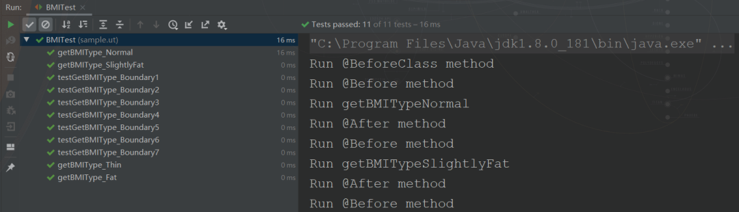指定参数化运行器Parameterized.class,在类上使用注解@RunWith(Parameterized.class); 定义公共属性参数,并添加注解@Parameterized.Parameter(下标),其中下标与数据集中的下标对应; 无须构造方法,直接准备测试数据集; 定义被测试类,测试类的初始化放在@Before方法中; 在被测方法中只使用一条语句即可: assertSame(expected, bmi.getBMIType());