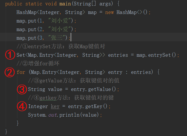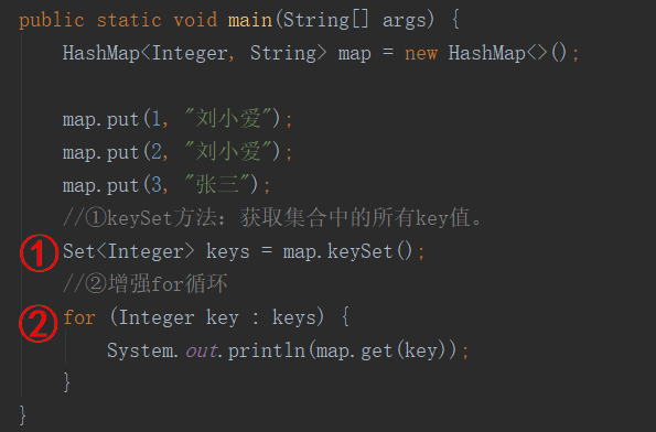 key值就类似于索引,但是它不允许重复,也不是有序的,所以需要先获取集合中所有的key值,再遍历。