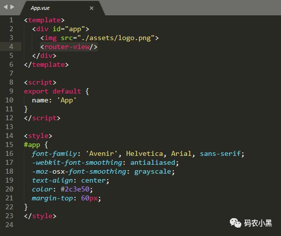 3.打开初始化的vue组件App.vue,它里面包含了template模板、script脚本和style样式,每个组件都基本由这三个部分组成,在template模板中引入了vue的logo图标,下面的 <router-view/>就是由路由产生的内容会显示在这里