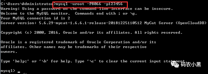 然后在本地打开cmd命令窗口,登录mycat,如图: