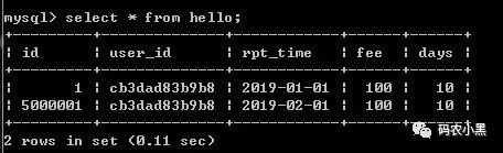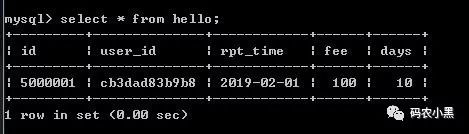 insert into hello(id,user_id,rpt_time,fee,days) values(5000001,@@hostname,'2019-02-01',100,10);