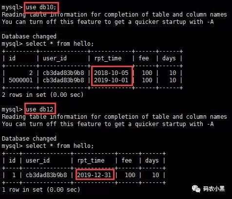 进入主库或者从库查询,发现10月份的数据保存在了db10数据库,12月份的数据保存在了db12数据库,按自然月分片成功!