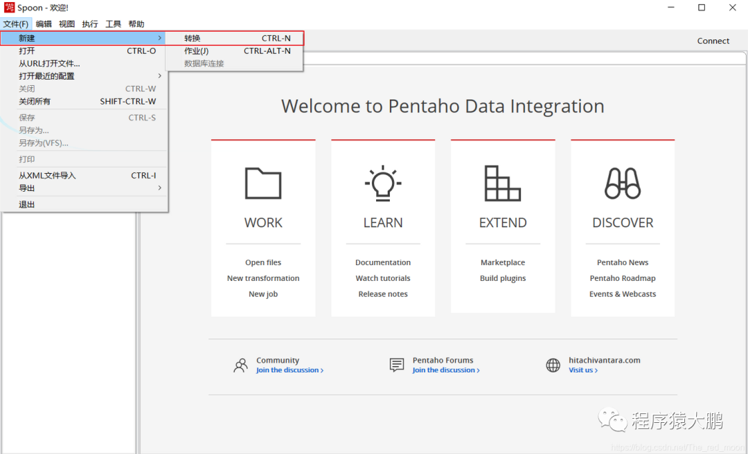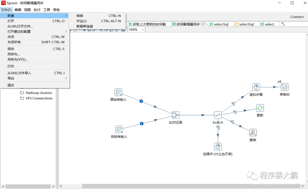 下载kettle后在kettle目录中找到Spoon.bat,双击运行,kettle可以新建两种不同的文件:transformation(文件格式为ktr)、job(文件格式为kjb),transformation针对数据进行基础转换,job则是完成对整个工作流的控制。