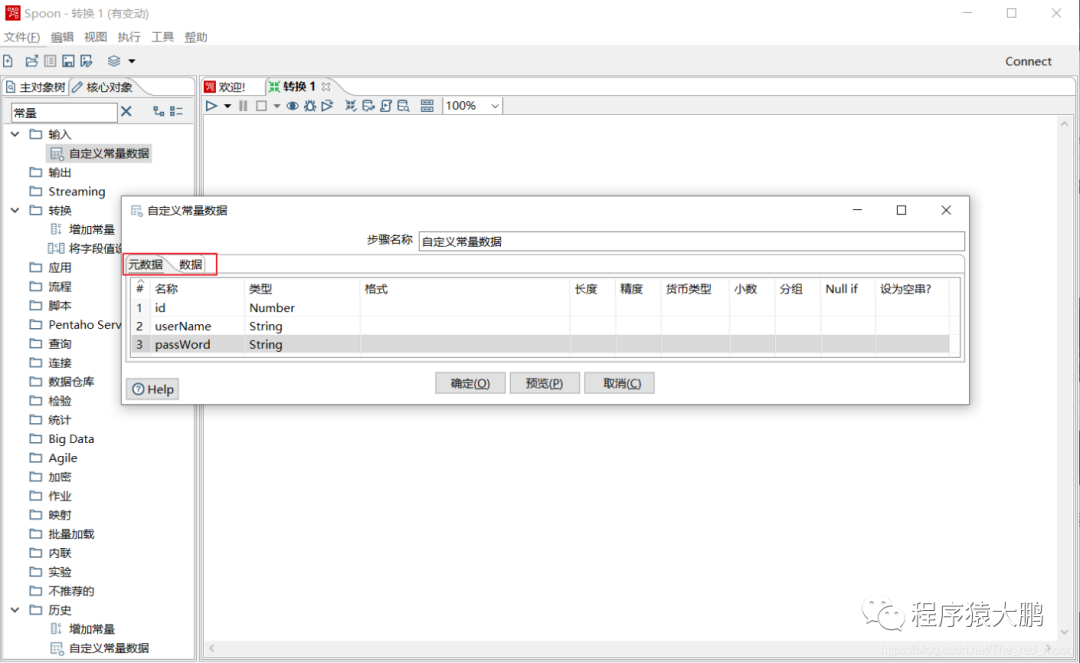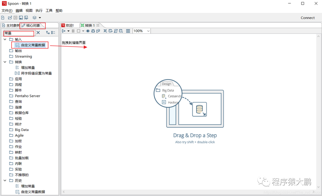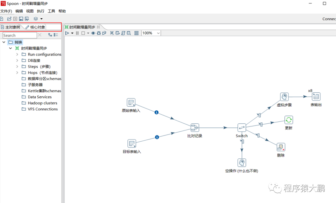 新建的文件左侧目录树有两个切换对象列表,主对象树是你现在使用的对象,核心对象是可以使用的对象。kettle的所有功能都由这些对象连接组成,使用时将核心对象中需要的对象组件拖至右侧编辑界面即可使用,组件功能与初始名称描述相同。