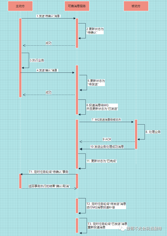 主动方在真正的业务开始前先向可靠消息服务发送一个“待确认”的消息 可靠消息服务收到待确认消息后持久化消息到数据库 如果以上操作成功则主动方开始真正的业务,如果失败则直接放弃执行业务 如果业务执行成功则发送“确认”消息给可靠消息服务,如果执行失败则发送“取消”给可靠消息服务。 如果可靠消息服务收到“确认”消息则更新数据库里的消息记录的状态为“待发送”,如果收到的消息为“取消”则更新消息状态为“已取消” 如果上一步更新的数据库为“待发送”,那么会开始往MQ投递消息,并且更改数据库里的消息记录的状态为“已发送” 上一步往MQ投递消息成功后,MQ会给被动方推送消息。 被动方收到消息后开始处理业务 如果业务处理成功,则被动方对MQ进行ACK回复,则这条消息会从MQ内移除掉 如果业务处理成功,则发送“已完成”消息给可靠消息服务 可靠消息服务收到“已完成”消息后更新数据库消息记录未“已完成”