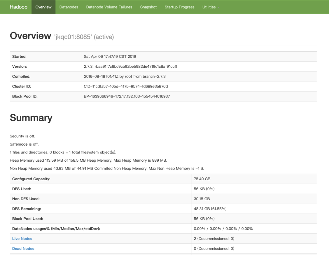 总集群最大存储能力:40GB*2 = 80GB (DataNode)