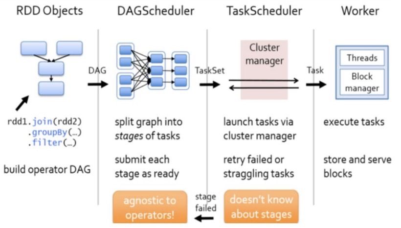 Spark摒弃了MapReduce先map再reduce这样的严格方式,Spark引擎可以执行更通用的有向无环图(DAG)算子。这就意味着,在MapReduce中需要将中间结果写入分布式文件系统时,Spark能将中间结果直接传到流水作业线的下一步。