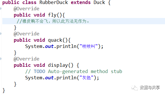 解决:橡皮鸭子类(RubberDuck)重写fly和quack方法。