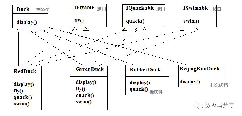 解决方法:没啥大不了的,将quack、fly、swim方法抽象到不同的接口中,超类(duck)中只保留display方法,不同的鸭子都继承超类并重写display方法,但是不同的鸭子对接口选择性的实现。