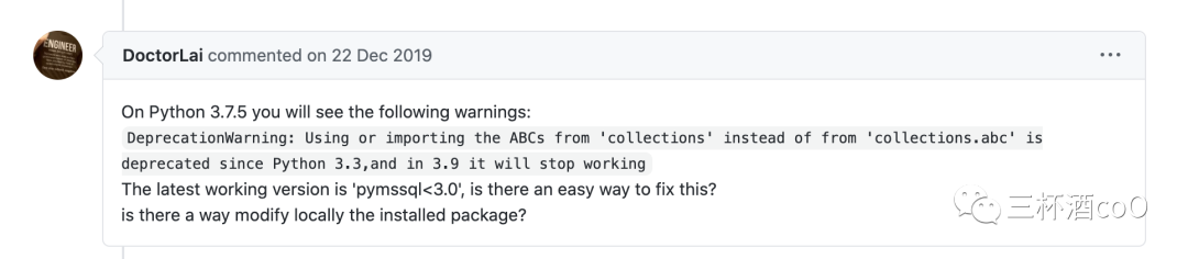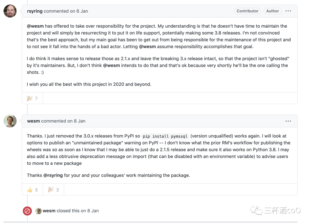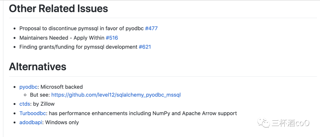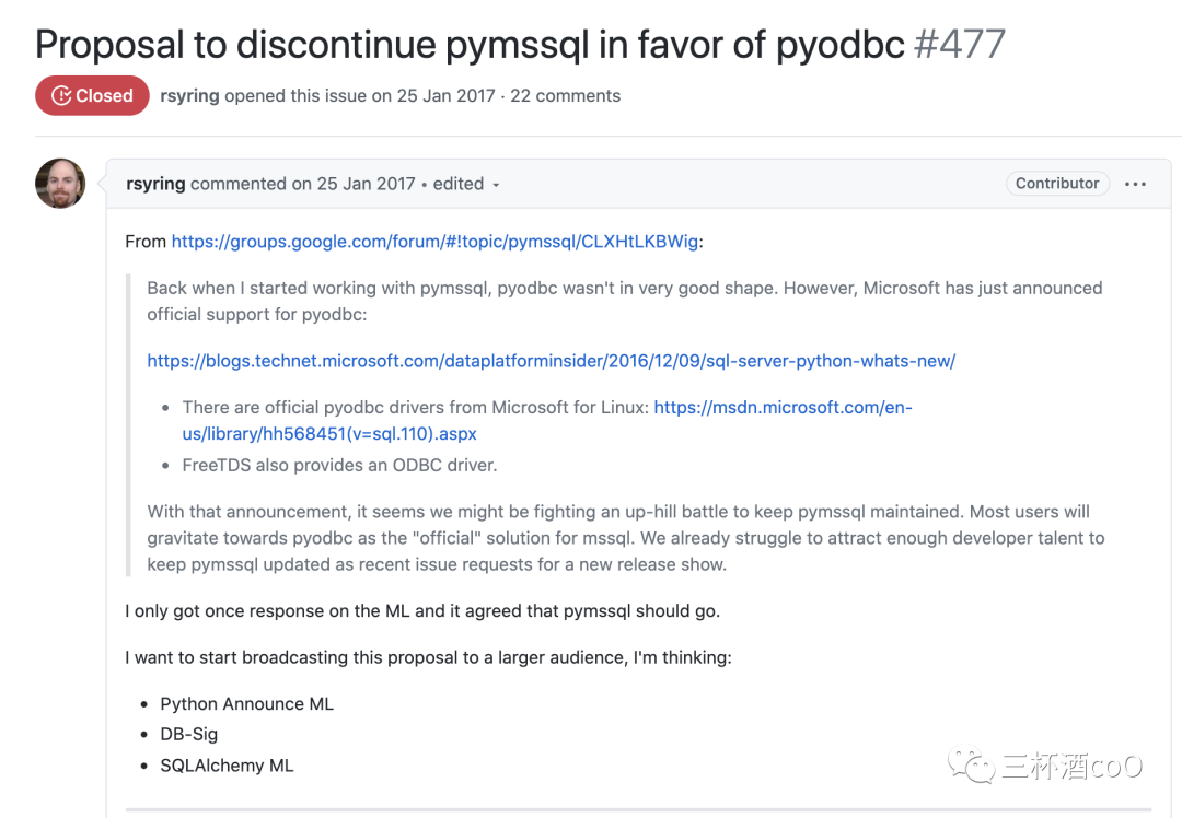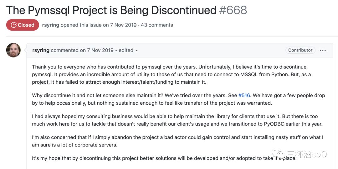 下面这个是Github上关于pymssql作者对于close该项目的的issue: