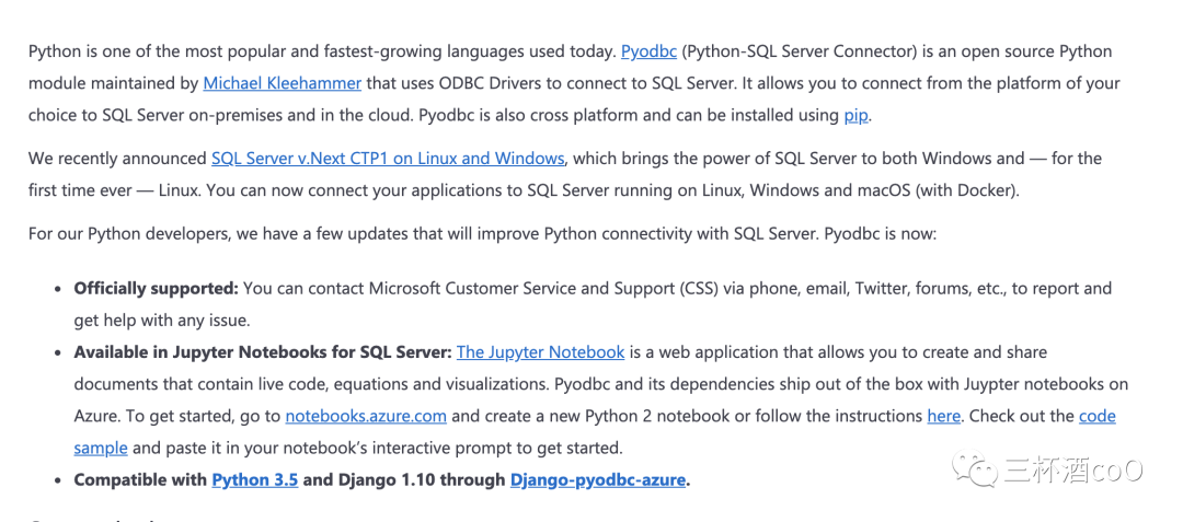 关于微软官方支持pyodbc的说明可以参考:https://cloudblogs.microsoft.com/sqlserver/2016/12/09/sql-server-python-whats-new/