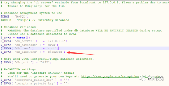 解压后进入DVWA下的config文件打开config.inc.php文件