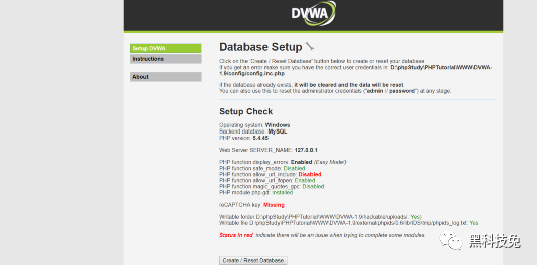 然后在浏览器中访问http://自己电脑IP/DVWA目录/setup.php,然后点击网站下方的Create/Reset Database按钮。