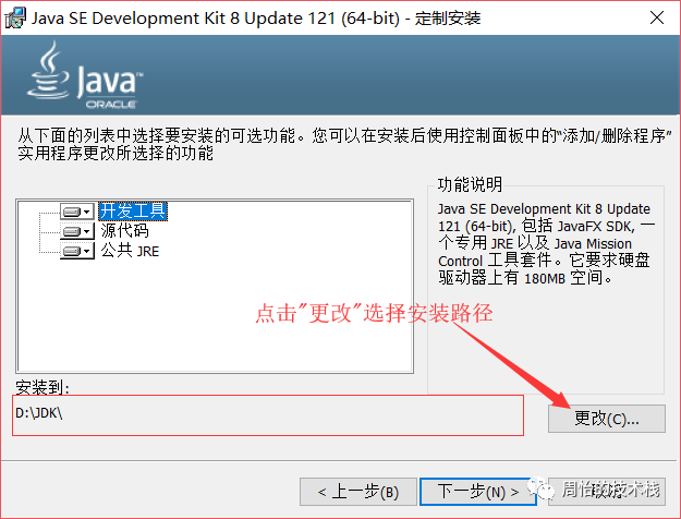 3.点击下一步,点击图中箭头所指地方,更改安装目录(一定要记住安装在哪里,后续配置环境需要用到目录位置),也可以不改,安装到默认路径,我这里改到D盘,点击下一步: