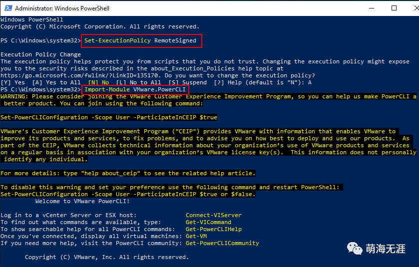 命令配置远程执行策略为允许,然后执行 Import-Module VMware.PowerCLI