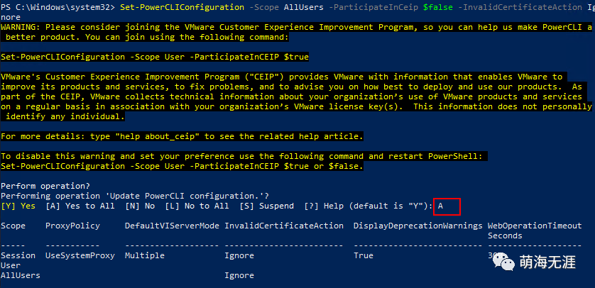 Set-PowerCLIConfiguration -Scope AllUsers -ParticipateInCeip $false -InvalidCertificateAction Ignore