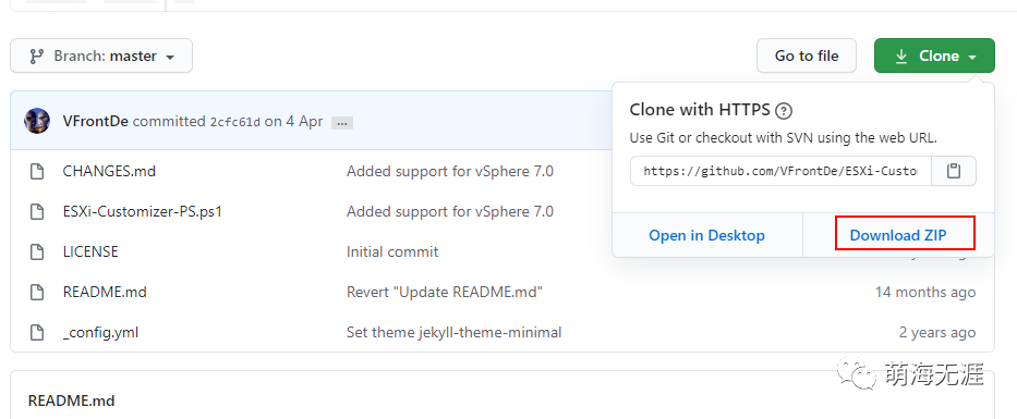 最新下载链接为https://github.com/VFrontDe/ESXi-Customizer-PS, 点击“DownLoad ZIP”即可下载。