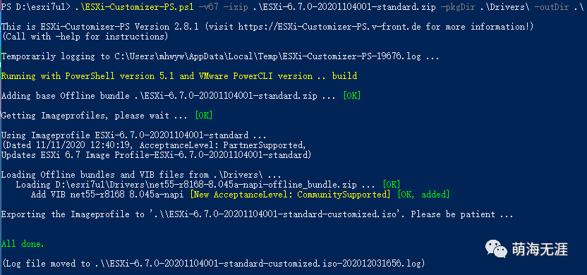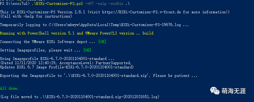 -ozip 不输出安装ISO,而是输出ESXi脱机捆绑包,可用于导入Update Manager,使用esxcli进行命令行修补或用作进一步定制的输入(这个很重要,我们先获取这个包,后面可以多次利用,也可以提前下载)