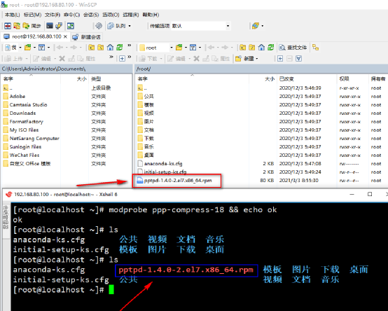 下载好pptpd这个软件包,通过WinSCP软件把pptpd软件包上传到root目录上,图下所示