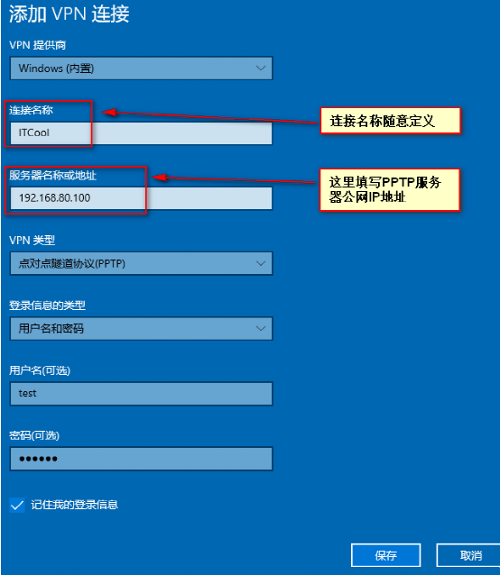 (3)弹出“添加VPN连接”界面后,需要输入VPN账号信息