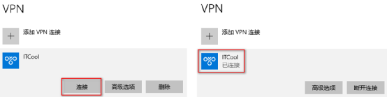 (4)返回“VPN”界面,选择刚刚创建的VPN连接,点连接,连接成功后会显示已连接,如图下所示