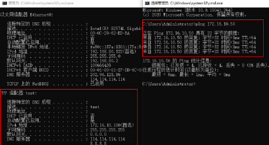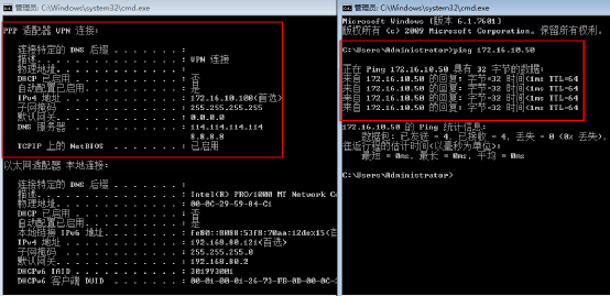 (7)测试VPN是否连接成功。用ipconfig/all可以看到PPP适配器已分配到内网的IP地址,ping VPN服务器内网地址172.16.10.50可以ping通说明(PPTP)VPN服务部署成功
