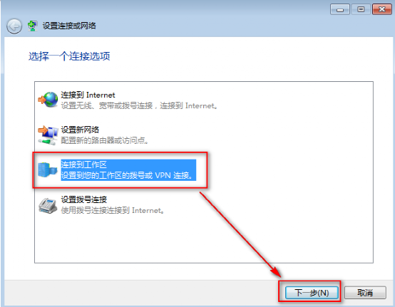 (3)在弹出的设置连接或网络的选项卡里选择“连接到工作区”