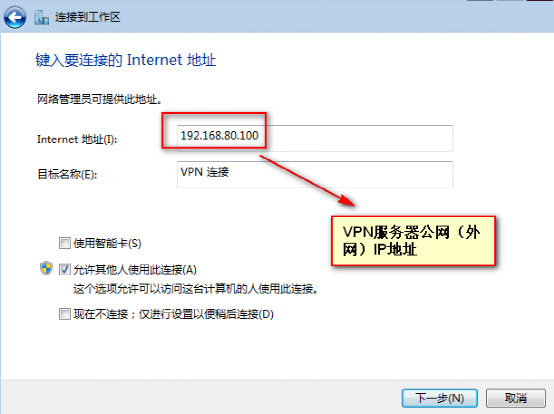 (5)填写VPN服务器的IP地址信息,然后输入新建VPN的名称,可自定义: