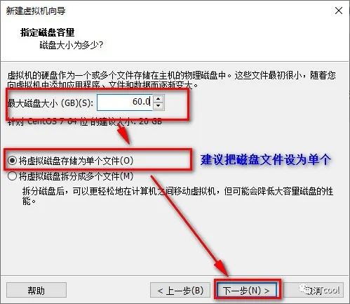 6.设定磁盘大小,并选择将磁盘存储为单个文件