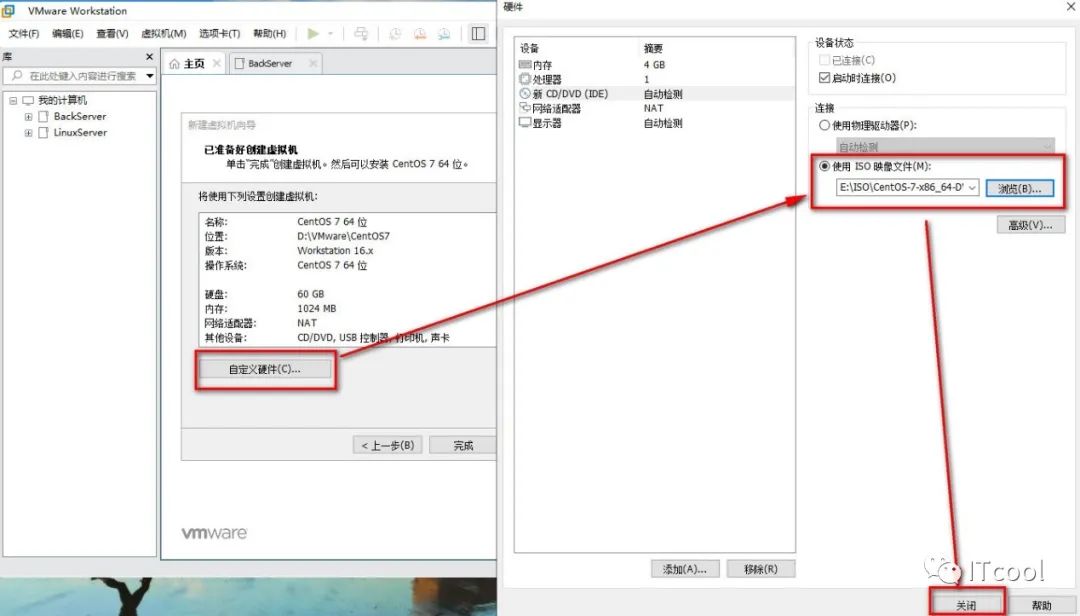 7.配置自定义硬件,删除一些不必要设备(USB、打印机等),选择已下载好CentOS7 ISO映像文件