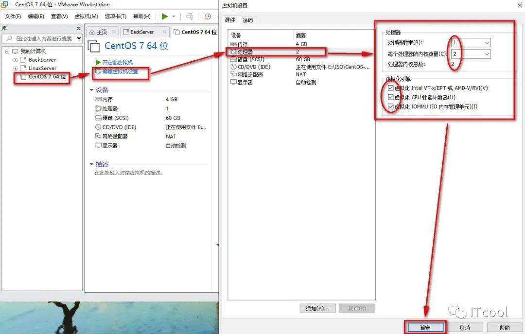 8.编辑虚拟机设置,设置处理器数量及内核数量,勾选虚拟机引擎