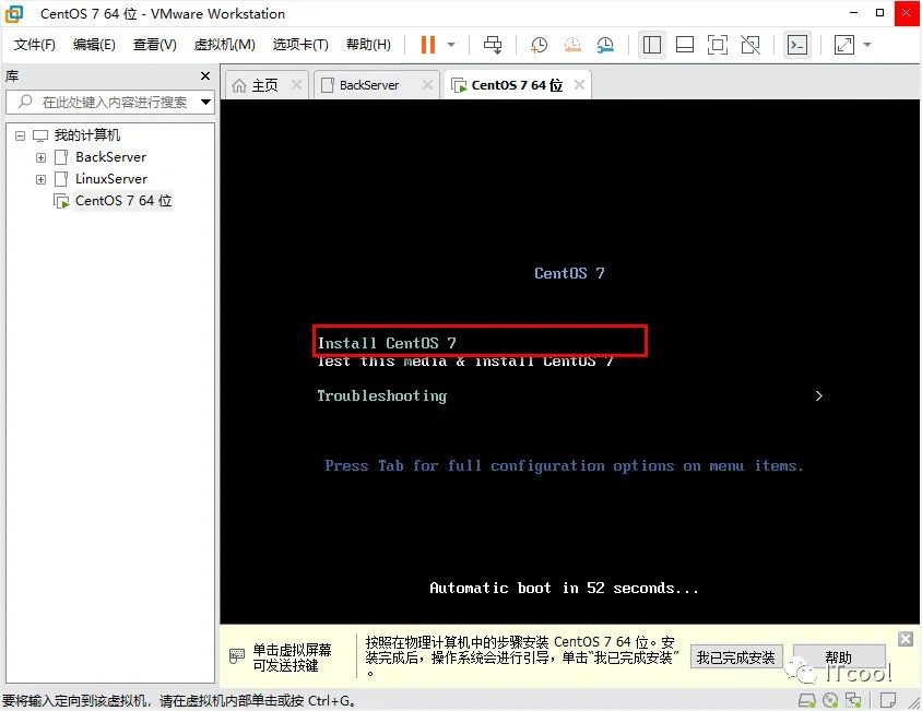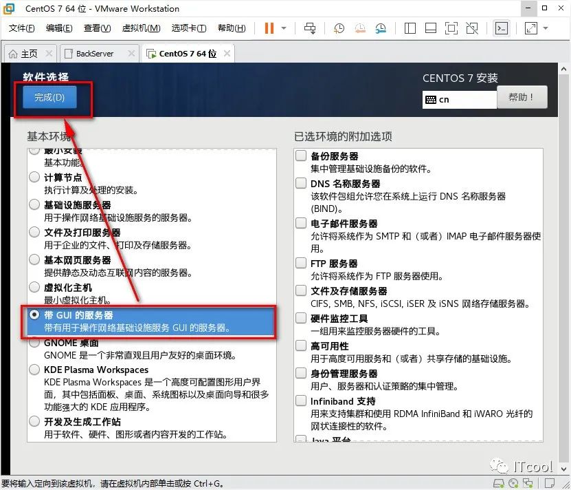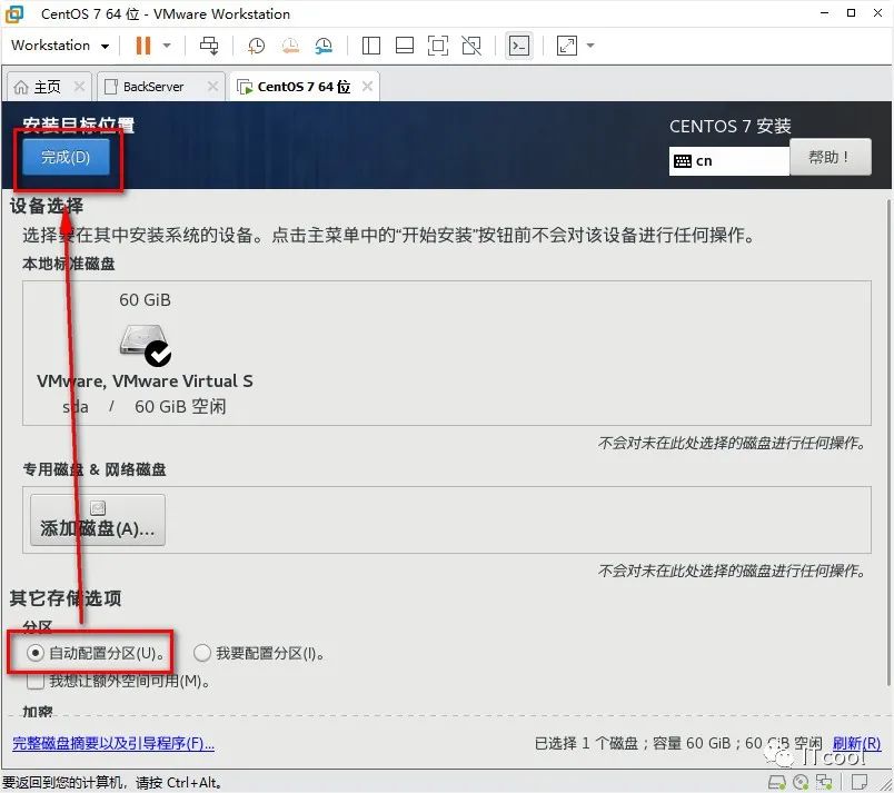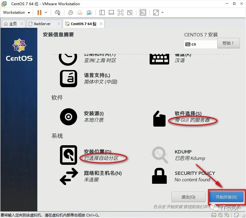12.软件选择,我这里选择带GUI的服务器、安装位置默认是自动选择--开始安装