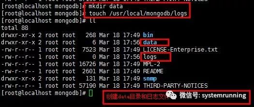 七、在/usr/local/mongodb/目录下创建存储数据目录和日志文件。