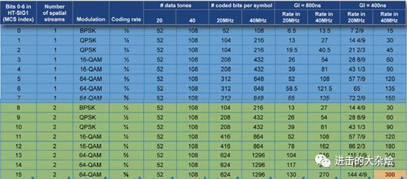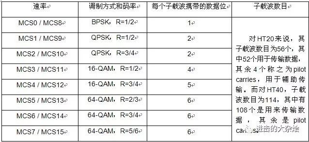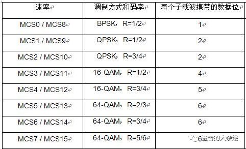 802.11n采用多种调制技术,但是在上表中每一列速率对应的码率(即有效数据和发出的数据的比率)是不一样的,例如在MCS7和MCS15时,码率是5/6,而在MCS6和MCS14时,码率是3/4。